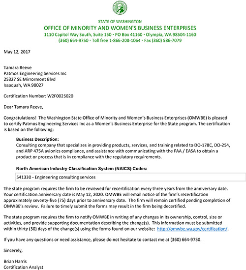 Patmos is certified by the Washington State Office of Minority and Women’s Business Enterprises (OMWBE) as a Women’s Business Enterprise for the State of Washington.